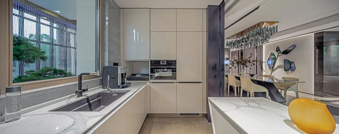 这里既是谈笑有鸿儒的会客厅,又是一家人亲密而舒适的互动空间,依循动线需求,让生活场景的呈现成为审美情趣和情感的寄语。超大开间短进深的空间设计,通透视线双倍面宽270°采光,让自然绚烂光景蔓延穿透窗棂,为生活每一刻浪漫加成,不被拘束的光影在这里都弥足珍贵。