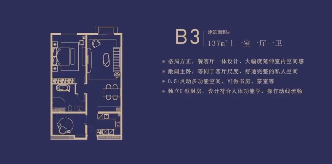 137一居,一室一厅一卫。户型方正,餐客一体,带多功能空间,可用作书房或衣帽间,独立U型厨房。
