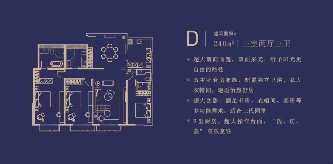 240三居,三室两厅三卫。双套房式主卧+大次卧,三卧及客厅均朝南,U型厨房,整体空间宽敞舒适。