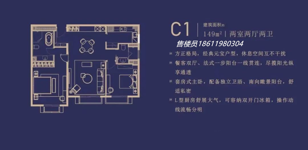 149两居,两室两厅两卫。双卧加客厅朝南,配步入式阳台,主卧带独卫及南向观景阳台,采光面大。厨房空间够大,动线流畅。