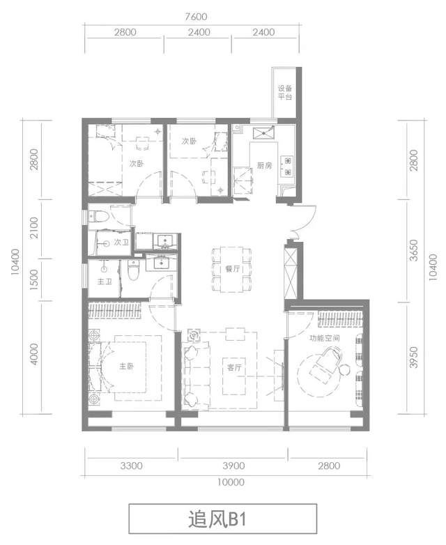 117四居,南北通透、全明格局,约10米南向三面宽+南向三飘窗,客厅面宽约3.9米,主卧面宽约3.3米,带独卫,餐客一体。