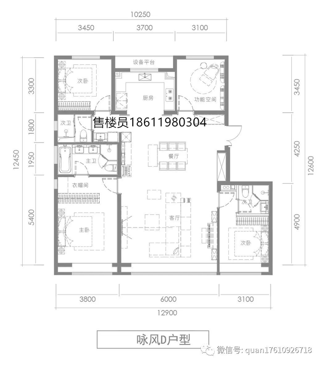 【D咏风户型】165四居,南北通透、约12.9米南向三面宽,南向三飘窗,客厅面宽达6米,主卧面宽约3.8米,主次卧双套房设计,U型开放式厨房。