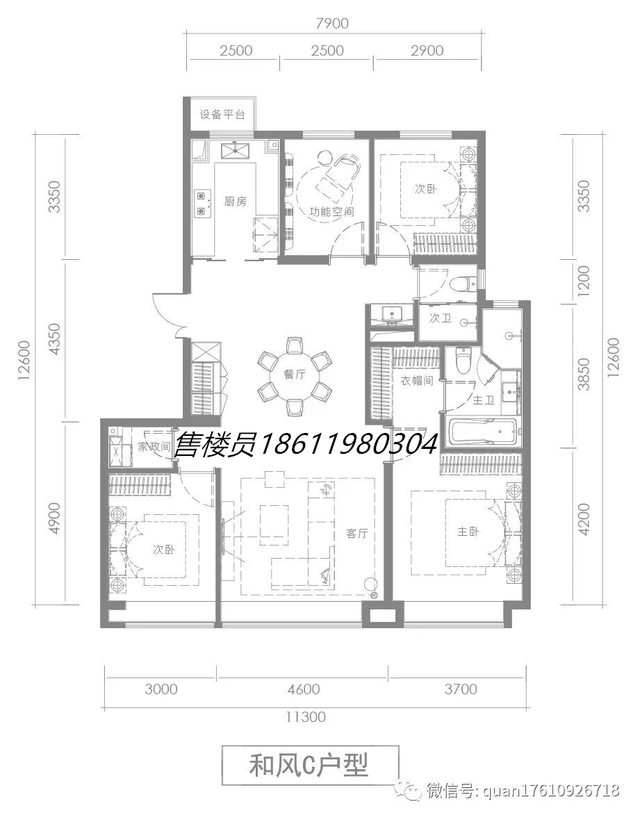 【C和风户型】145四居,南北通透,约11.3米南向三面宽,客厅面宽约4.6米,主卧面宽约3.7米,奢华主卧套设计,带独卫,餐客一体。