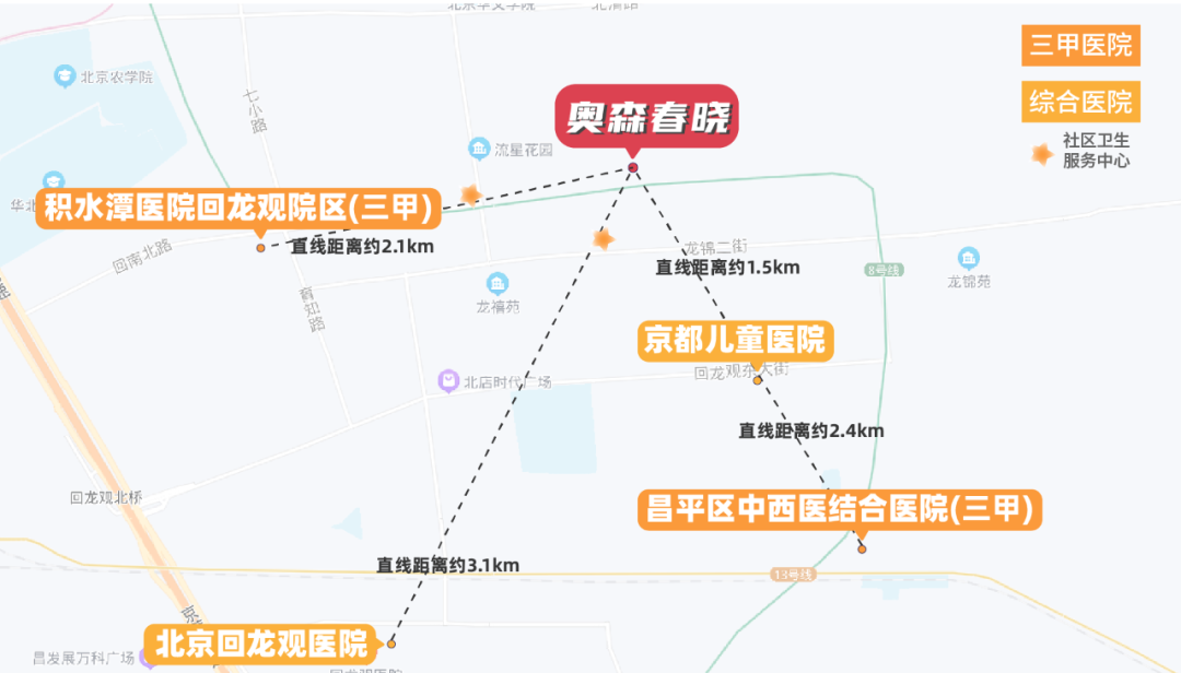 综合医院:京都儿童医院(约1.5km)、北京回龙观医院(约3.1km)