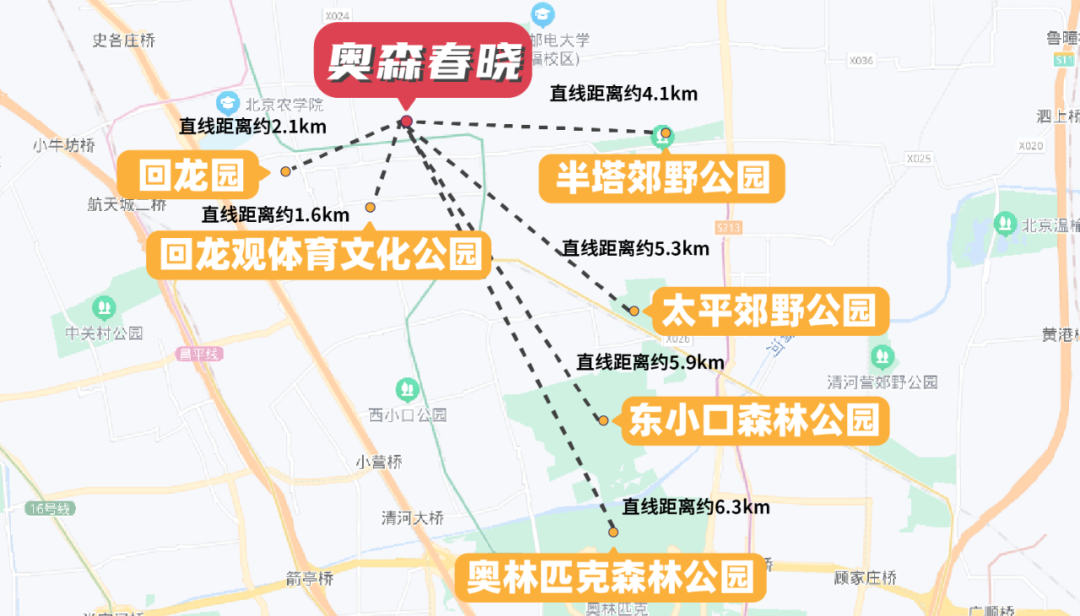 回龙观体育文化公园(约1.6km)、回龙园(约2km)、白各庄生态湿地(约4.2km)、半塔郊野公园(4.6km)、太平郊野公园(约5.3km)