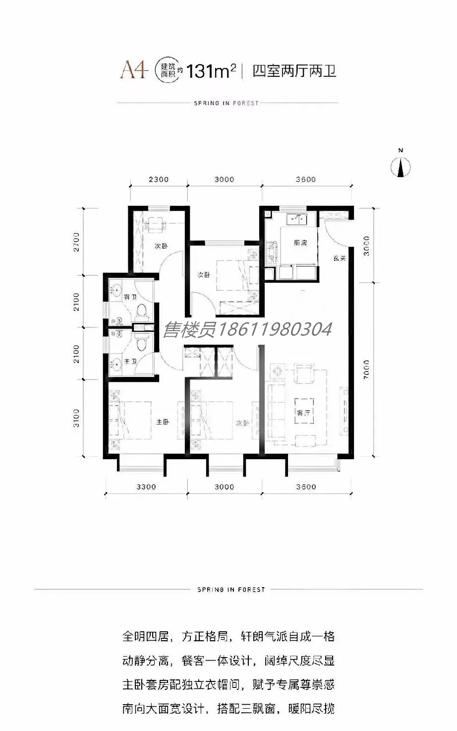 131平的四居,南向三面宽,客厅+双卧朝南,次卧+书房+厨房朝北,动静分区的设计,主卧套间设计,带独立的卫生间和衣帽区。全明格局,采光和通风效果都很好,南向还带三飘窗。