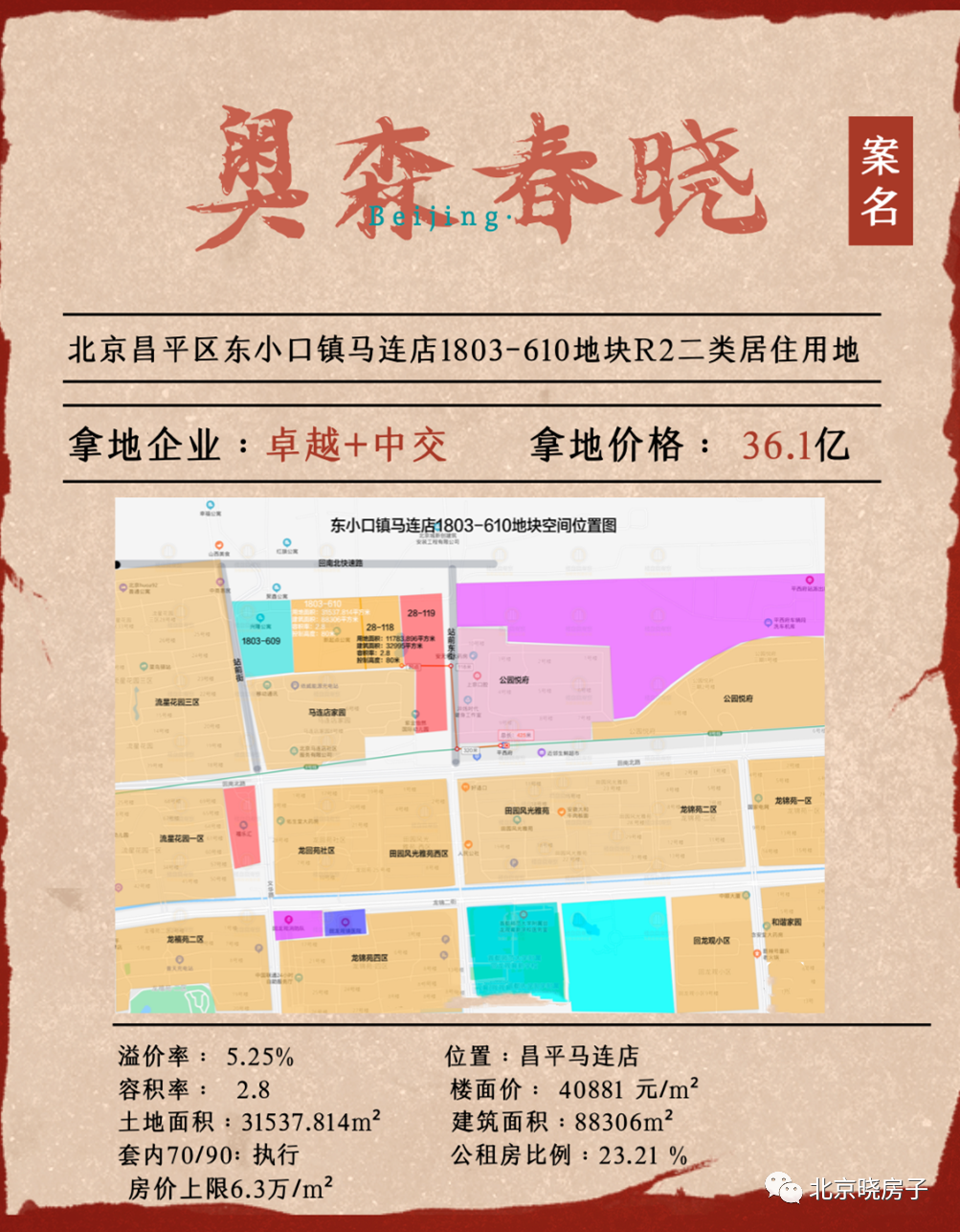 东小口马连店组团旧村改造项目1803-610地块起拍价34.3亿,最终由卓越+中交联合体,以总价36.1亿,配建20500公租房代价拿下。
