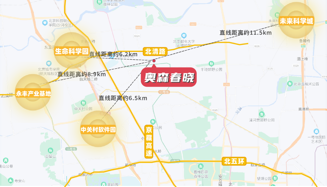 自驾:项目临近北清路,从项目出发可快速通达由北清路串联起的翠湖、永丰、生命科学园等一众高新产业基地。此外,项目西侧为京藏高速,向南可达北三环健翔桥,向北可至居庸关。