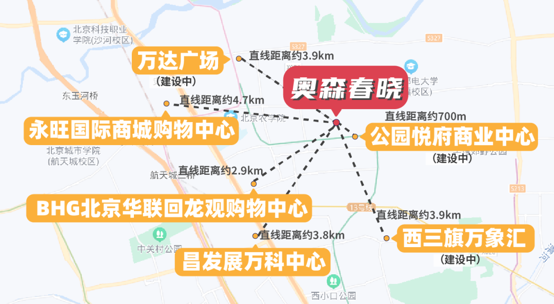 已建成商业:BHG北京华联回龙观购物中心(约2.9km)、昌发展万科中心(约3.8km)、永旺国际商城购物中心(约4.7km,建面约9万平)