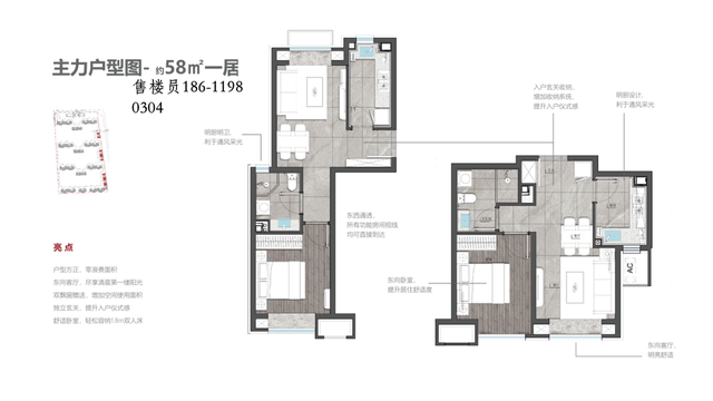 58一居为东西向,较方正的为纯东向,东西向为全明格局,都比较紧凑。卫生间做到干湿分离,厨房L型设计,设有玄关。