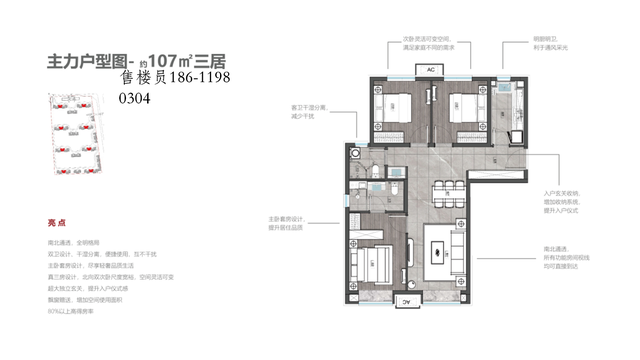 107三居南北通透,设有超大玄关,主卧套与客厅朝南,卫生间干湿分离。北向两个次卧中间墙体可打通。