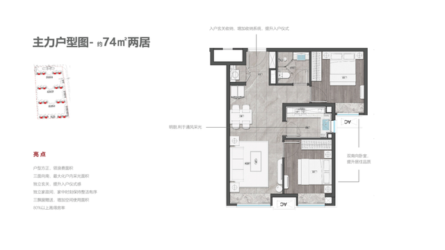 74两居为纯南朝向,双卧朝南,卫生间干湿分离,设有玄关,增强仪式感,整体设计合理,可利用空间较大。