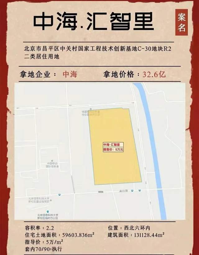 中海汇智里,一次北京楼市从未有过的取证奇迹!中海汇智里从2月16日成功拿地到4月2日正式取得预售证,2022年2月16日北京中海以32.6亿成功竞得昌平区中关村国家工程技术创新基地C-30地块。