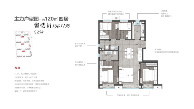 120四居全明,南北通透,经典九宫格格局。门口设有储物柜,增加收纳功能。南向三面采光,双卧朝南。餐客厨一体,卫生间干湿分离。北向两个次卧中间墙体可打通,可根据生活变化灵活调整。