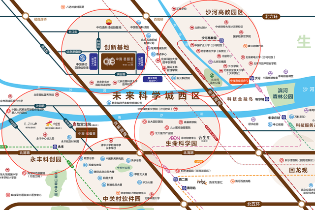 在项目腹地内有“中关村科技创新基地”,东部紧邻“沙河高教园”,南部分别是“生命科学园”、“中关村软件园”和“海淀永丰科创园”。