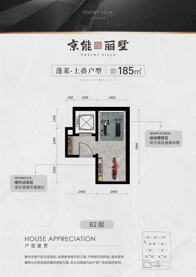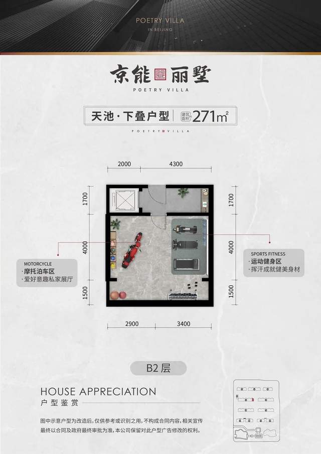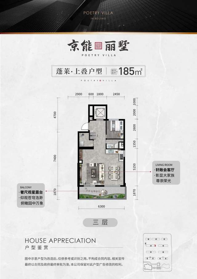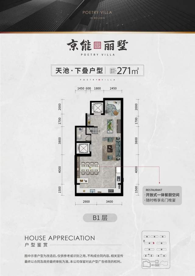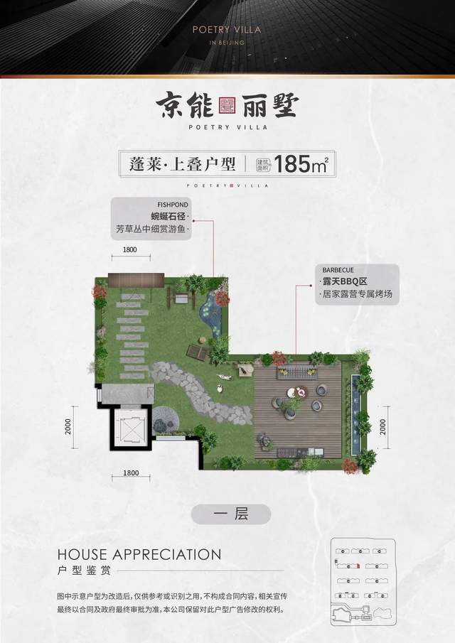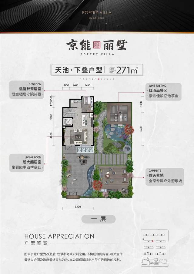 特点:户户赠送私家户内电梯,一层入户花园,首层层高3.3米,地下一层层高3.85米,最大7.5米宽厅设计。