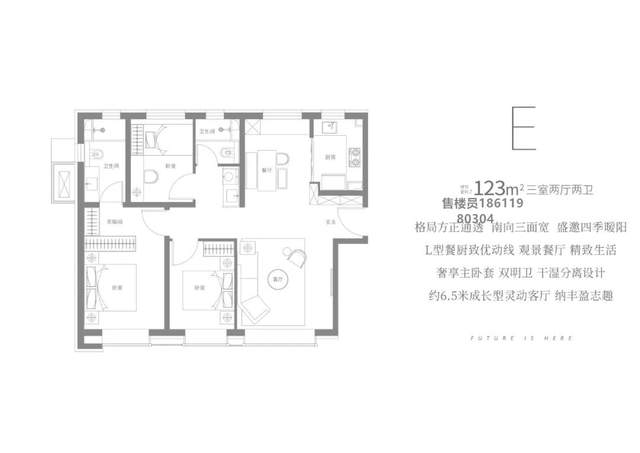 以建面约123平米的三室两厅两卫户型为例。整体设计南北通透、户型方正、空间阔绰、功能分区合理,满足了区域刚改人群对于大尺度生活空间的想象。难得的是,该户型做到了市面上罕见的九窗全明设计,叠加上南向三面宽和超亮眼的窗墙比,室内采光效果被瞬间拉满。