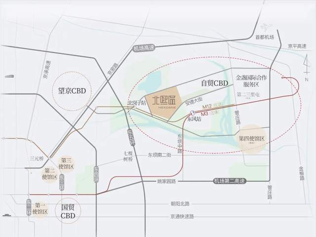随着望京CBD的逐渐饱和,朝阳区早在2014年前后就开始对东坝北区进行了新商务区的规划。2020年9月21日,国务院印发《中国(北京)自由贸易试验区总体方案》的通知,中国(北京)自由贸易试验区正式揭牌。其中,东坝将主要承载国际交往中心功能、高品质公共消费功能以及国际贸易合作功能,是北京产业新聚集地。至此,在国贸、望京之后,一个新的CBD——自贸CBD应运而生。