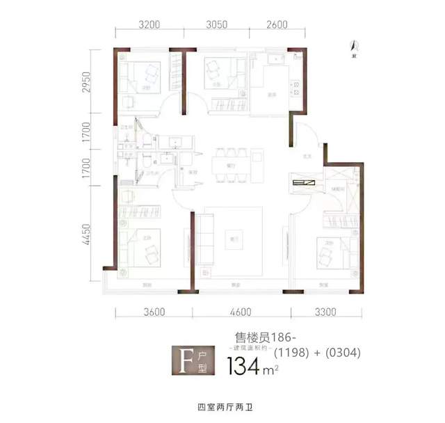 此户型为118平米四居室,四叶草户型,客厅和两个卧室全部朝南,保证了采光面,主卧带卫生间,带转角飘窗,也是明卫设计,另外两个卧室朝北,保证了房子的私密性,互不打扰,非常适合改善客户。
