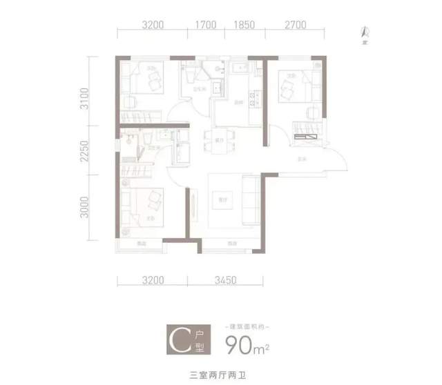 此户型为90平米南北通透三居室,客厅、主卧朝南,主卧带卫生间,明卫设计,两个次卧、卫生间朝北,客卫也是明卫设计。