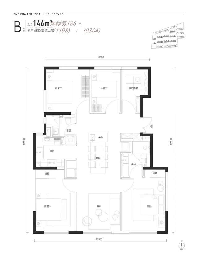 146平可变五居户型方正,南向三面宽达10.5米,南北通透。南向空间同样可打通变为大横厅,也可以通过移动隔墙变为南向双卧+客厅。北向空间可以隔断为双次卧+书房,主卧带浴缸,卫浴分离。