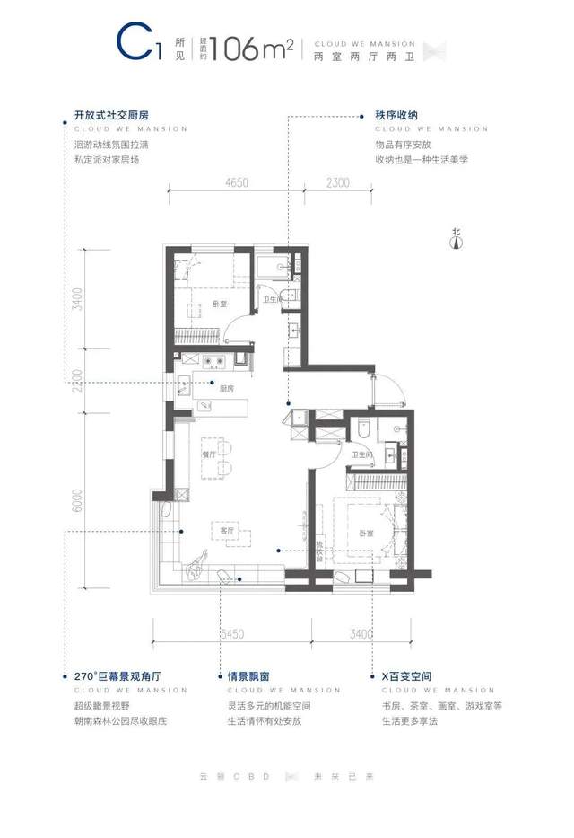 106平两居,同样在客厅设置270度转角飘窗,南向主卧,套房设计,餐客厨一体,厨房U型设计,卫生间干湿分离。