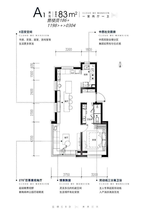 83平一居,南北通透,客厅带有270度超大转角飘窗,卧室带有飘窗,U型厨房设计,卫生间干湿分离。