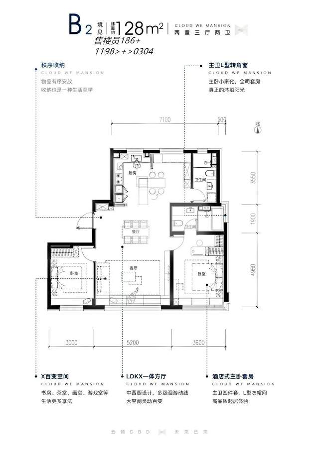 128平三居,南向三面宽,面宽11.8米,主卧套间设计配置步入式衣帽间和干湿分离卫生间,主卫设置L型转角窗,餐客厨一体。