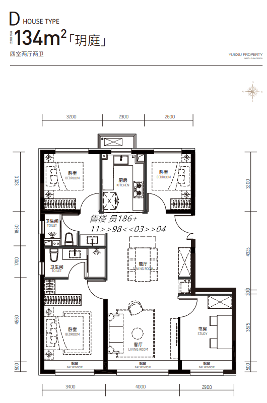 134平左右的四居两厅两卫户型,最大亮点是三个面宽朝南,客厅面宽达到4米,非常舒服。