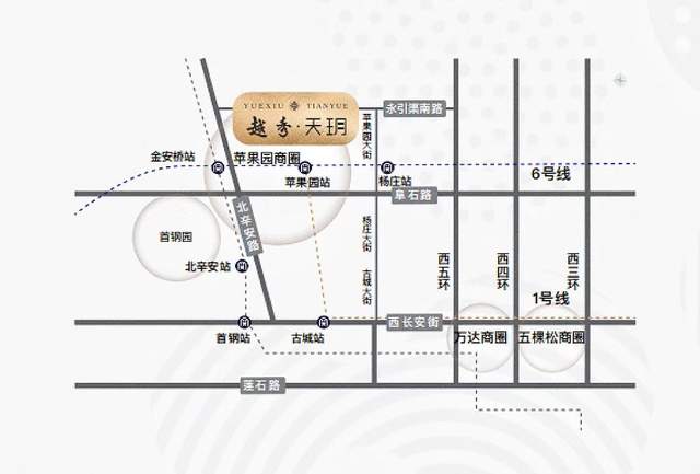 双轨:越秀·天玥仅约760m(直线距离)可达6号线杨庄站,仅约980m(直线距离)达三轨交汇的大型交通枢纽站苹果园站,双轨驱动通达全城。