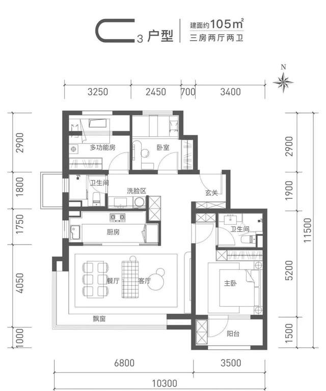 南北通透+南向三面宽,这个户型绝对是小三居的天花板,客厅+双卧朝南,客厅面宽约3.4米,LDK一体化的设计。