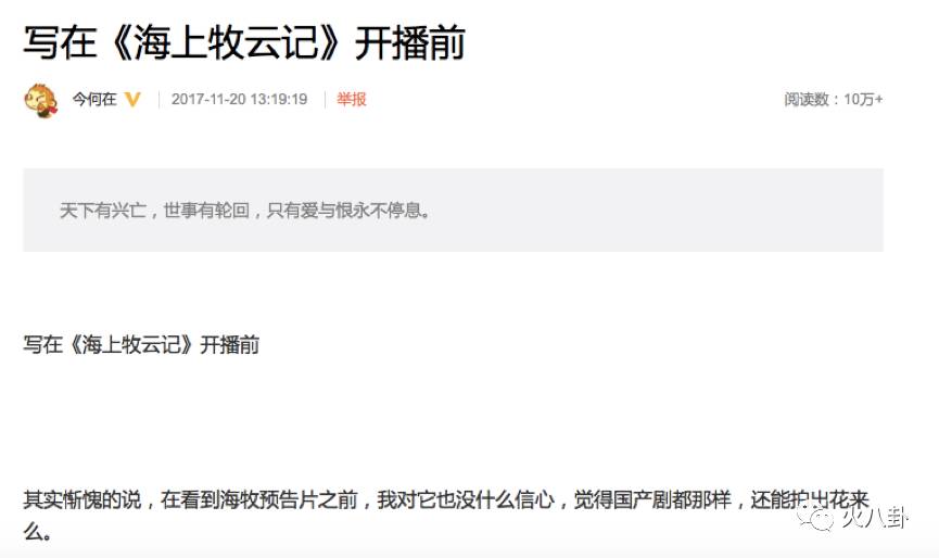 和披着奇幻仙侠外壳的偶像剧之流不同,《海上牧云记》改编自今何在的同名小说,是按照九州世界的设定虚构出来的魔幻史诗,被称作是“中国版《权力的游戏》”!其实!你们知道吗?作者今何在在拍摄初期并没有对一部国产剧抱有太大的信心哦~