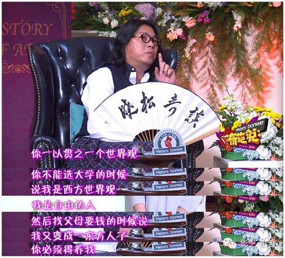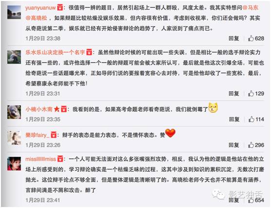 如果这件事只有这一面,那也没有太大的意义,不过就是某些专业的辩手在场上比较没有风度地碾压非专业辩手而已,但是——任何事都因为有了这个“但是”而变得意味深长......在这期节目中,还有一个自称要来证明超模不是无脑的女生,被蔡康永(呈现了过分浮夸的演技)纳入麾下,实现了非常强的娱乐效果,但争议纷至沓来。实际上,《奇葩来了》第三季的选人方针让人越来越看不懂,有大胡子装娘娘腔毫无辩论才华也能拿到待定的,有撒泼打滚耍赖皮、没正经辩论居然也能晋级的(1月30号那期节目),相当一部分选手都是因为其个人奇葩的经历而取胜,立论、驳论这种严谨的过程没见着,“辩论”反而成了次要了。这不由得让人想起高晓松在第一季时对一位选手说过的话↓↓↓