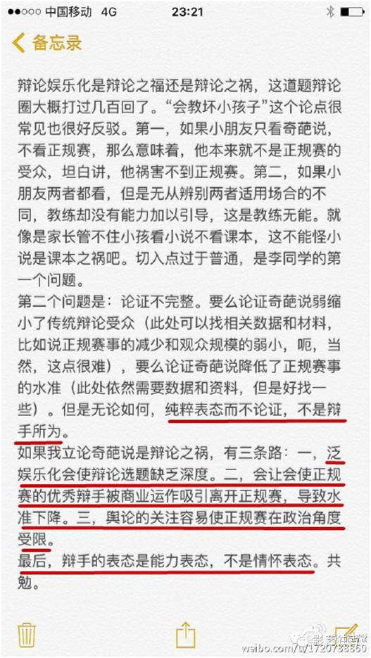 马薇薇一向以严谨著称,她发的这条微博中,也有批评得在理之处,例如“切入点过于普通”、“论证不完整”等等。实际上这位过分偏激的选手一上台亮出自己的态度时就已经掉进了“坑”,拿情怀来说事确实不足以让人信服,而且他并没有经过严格的辩论训练,导致他在陈述自己的观点时并没有举出例证,这种级别的对手对马薇薇、邱晨等拥有丰富辩论经历的辩手来说简直是轻轻松松就能KO的。