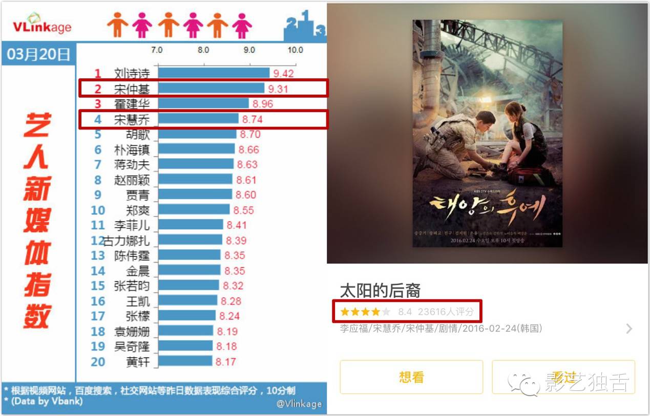 近段时间最热门的电视剧,毋庸置疑是韩剧《太阳的后裔》(下称《太后》)了,韩国本土最高收视已达28.8%,其他两个公共台的收视还没它的零头高;在中国,官方独播视频网站爱奇艺的总播放量(暂时)也已达到10.37亿。评价方面,中国的大众评分网站——豆瓣的评分是8.4,即便豆瓣上的日、韩剧评分一向有水分,这个分数也能表明《太后》确实是一部还可以的作品。新浪微博的话题页面上,#太阳的后裔#阅读量有55亿,从《太后》播出以来,该剧两位主演宋仲基、宋慧乔的艺人新媒体指数屡次跃上前三,宋仲基更是在头号位置坐了相当长一段时间。