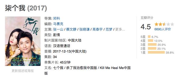 因此,这部剧从一开播便颇具话题度,但是截至目前,《柒个我》口碑却不如人意,豆瓣评分4.5 。太过贴近韩版的剧情、人设和各种辣眼睛的造型是最大槽点。