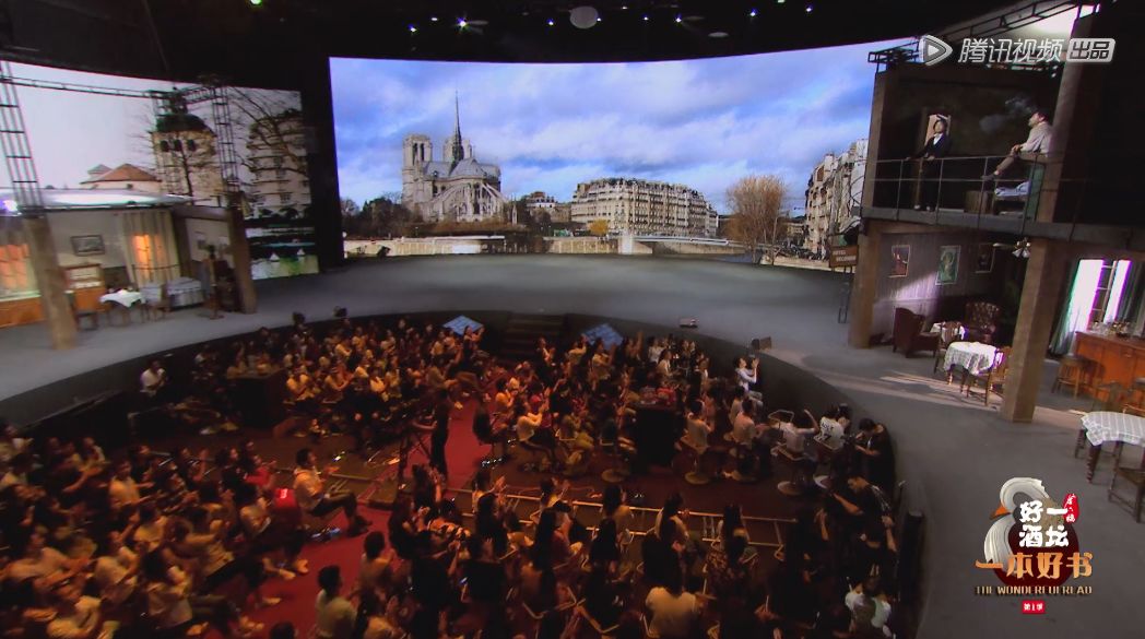 两个角色的切换,得益于《一本好书》启用了国内综艺少见的环形舞台,根据故事需要,环形舞台可以通过灯光、置景的变化,切割成不同的时空与场景。