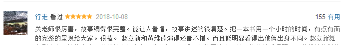 关于这档节目,看看这一条豆瓣高赞短评:关老师很厉害,故事编得很完整。把一本书用一个小时的时间,有点有面地、完整地呈现给大家。