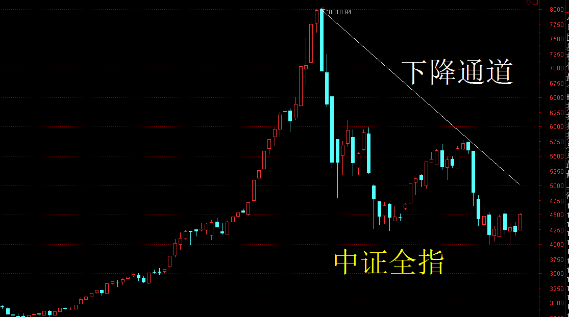 从5100下跌以后,市场仍处在下跌趋势中,市场并未打破两市全指的下降通道,从上图走势看,市场未来是否能打破5100以来暴跌趋势依然有待验证。