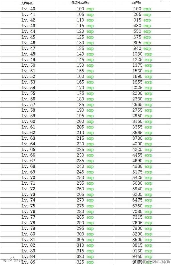 DNF冒险团角色提供经验表
