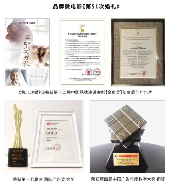 MEMORA诗普琳品牌微电影《第51次婚礼》荣获第十七届IAI国际广告奖金奖;第四届中国广告年度数字大奖铜奖;第十二届中国品牌建设案例【金象奖】年度最佳广告片奖。