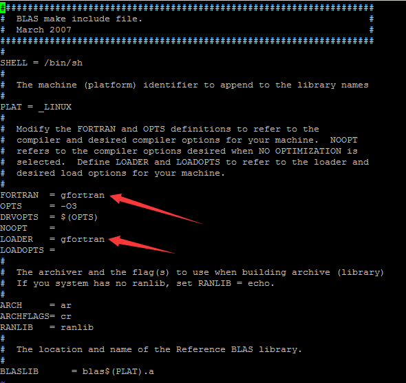FORTRAN = gfortran和LOADER = gfortran 可以修改为指定的fortran编译器。