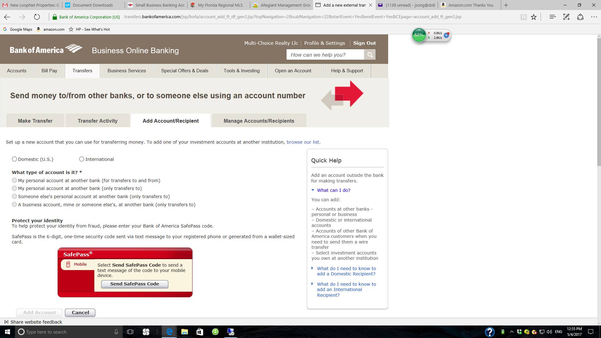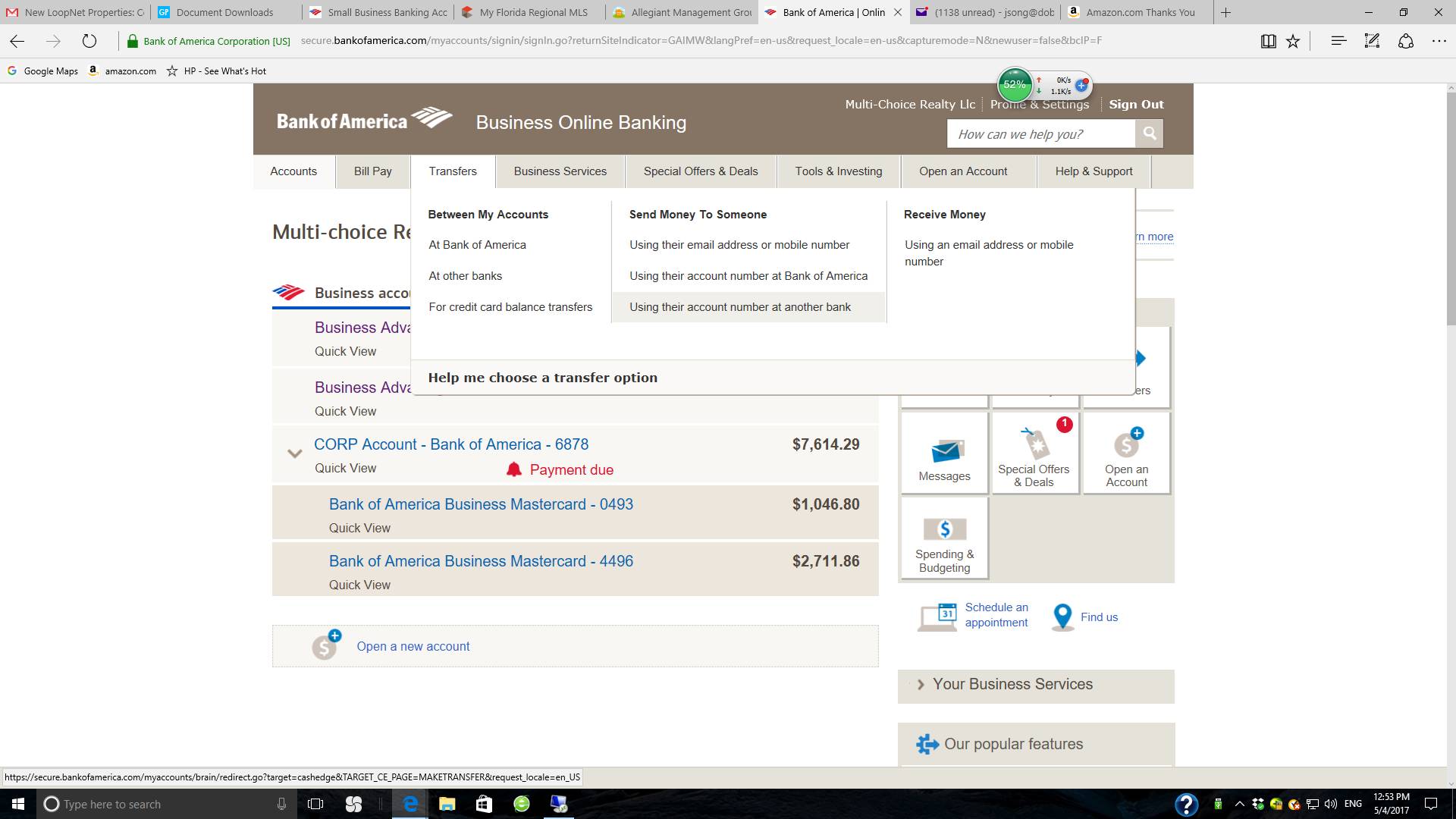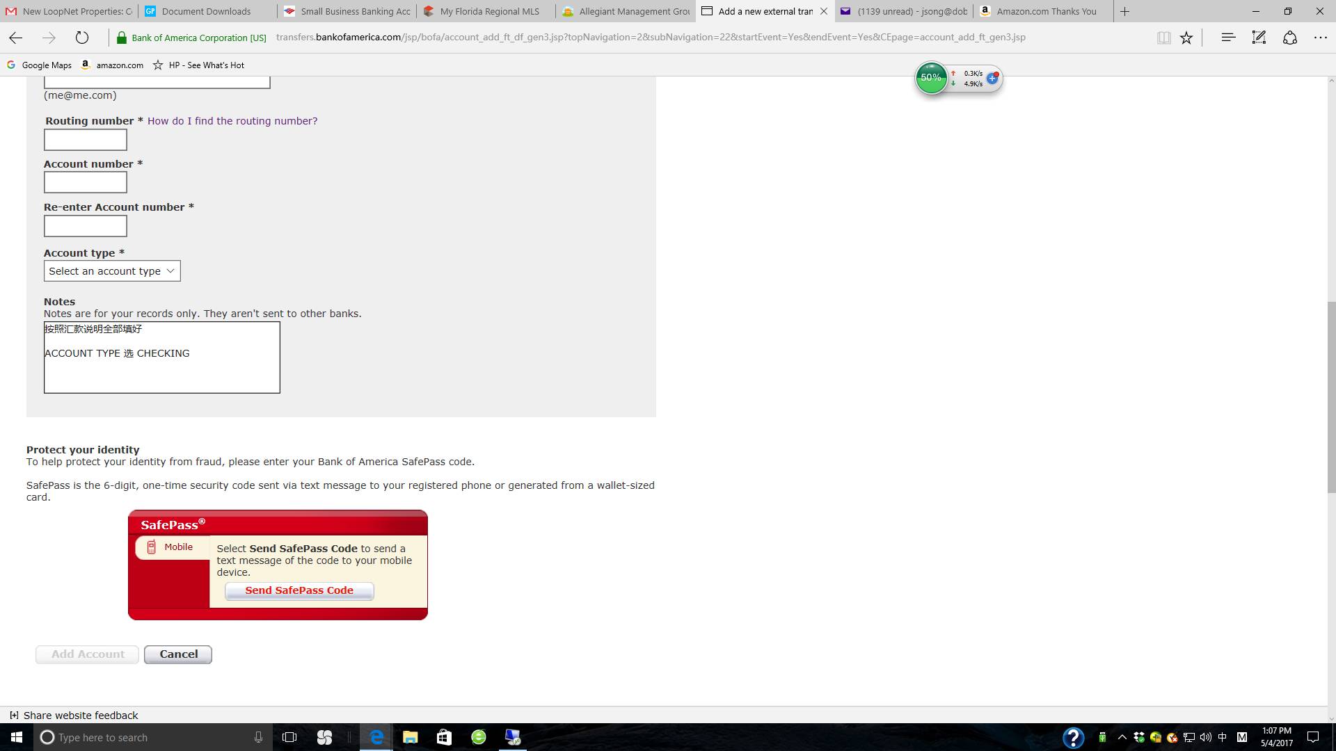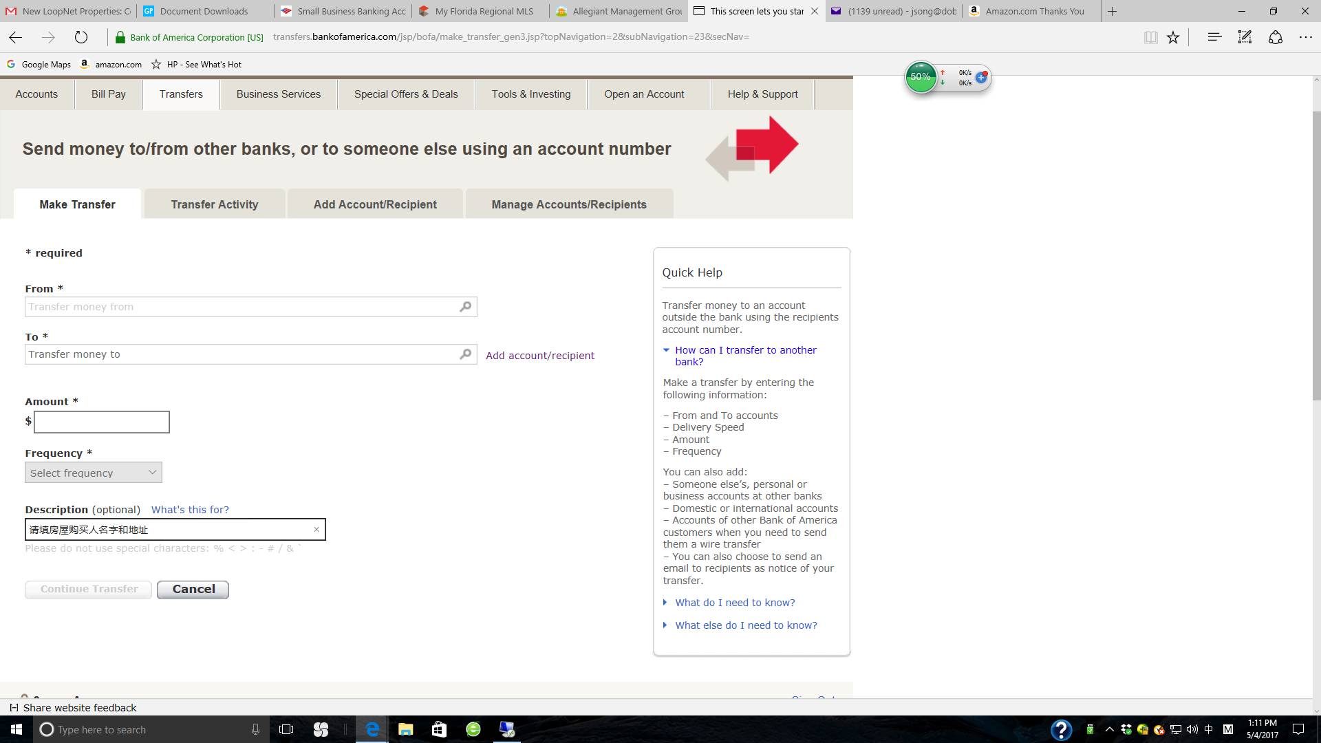 进入美国银行账户, 按上图点击transfer/using their account number at another bank。