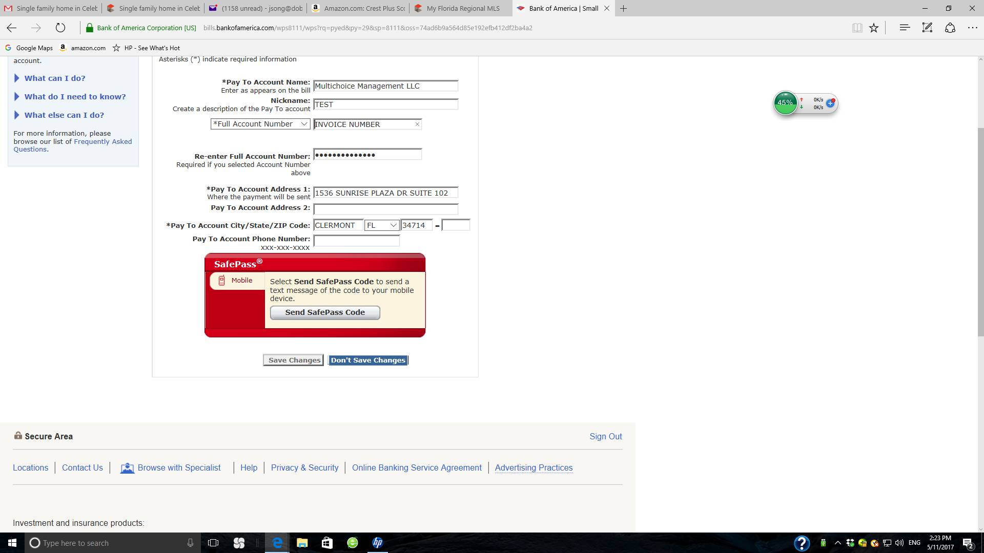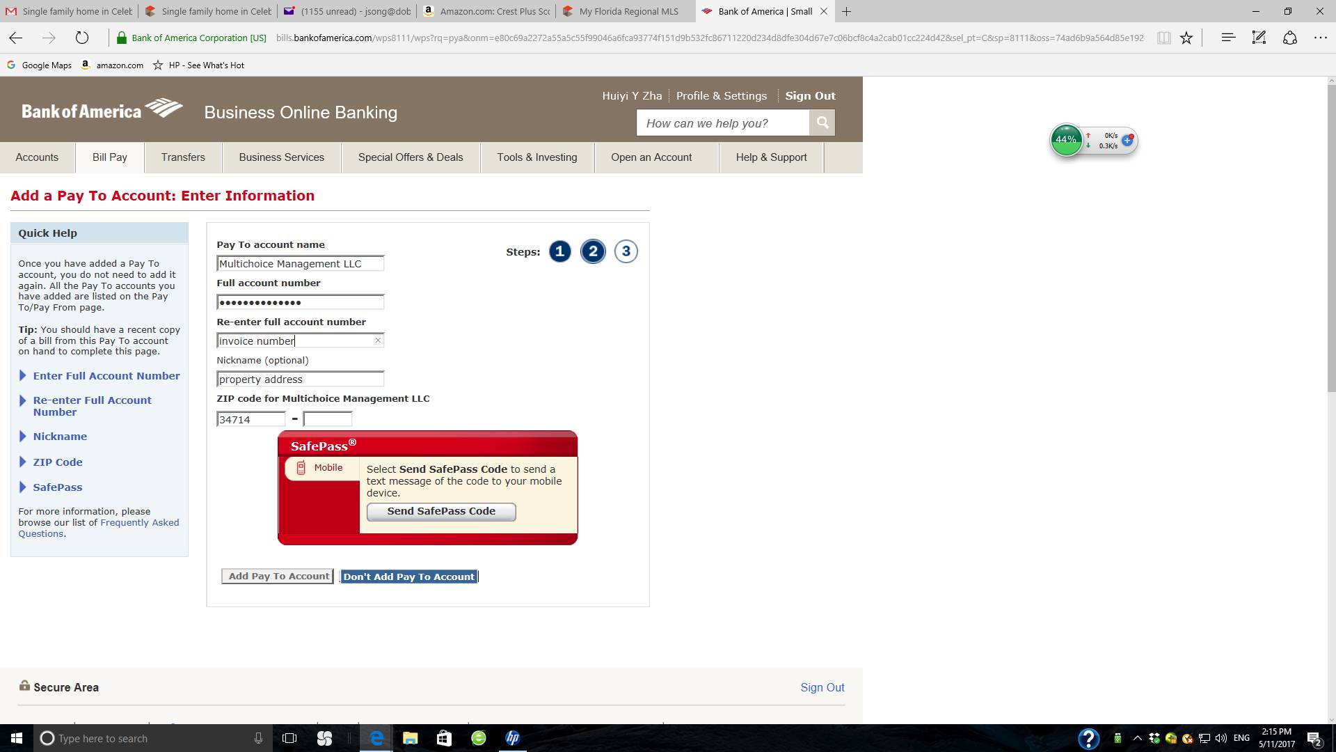 输入账单号两次, 房屋地址, 邮编, 要求设置SAFE PASS, 输入验证码, 最后点击 ADD PAY TO ACCOUNT