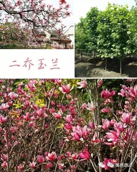二乔玉兰学名 Magnolia soulangeana Soul-Bod,为木兰科木兰属植物,又名朱砂玉兰,紫砂玉兰。二乔玉兰是白玉兰和紫玉兰的杂交种,1820~1840年培育而成。形态特征:落叶小乔木,高6~l0米。小枝无毛。叶倒卵形,先端短急尖,叶面中脉基部常有毛,背面多少被柔毛,叶柄被柔毛,托叶痕长为叶柄的三分之一。花先叶开放,花大呈钟状,紫色或红色,里面白色,有芳香,花被片6~9枚。蓇葖果黑色,具白色皮孔,种子深褐色。花期2~3月,果熟期9~10月。生态习性:阳性树,稍耐荫,最宜在酸性、肥沃而排水良好的土壤中生长,微碱性土也能生长。喜肥,肉质根不耐积水。喜空气湿润,耐寒性较强,对温度敏感。不耐修剪。寿命可达千年以上。育苗栽培:以嫁接繁殖为主,亦可用压条、扦插繁殖。绿化用途:二乔玉兰是优良的观赏树种。