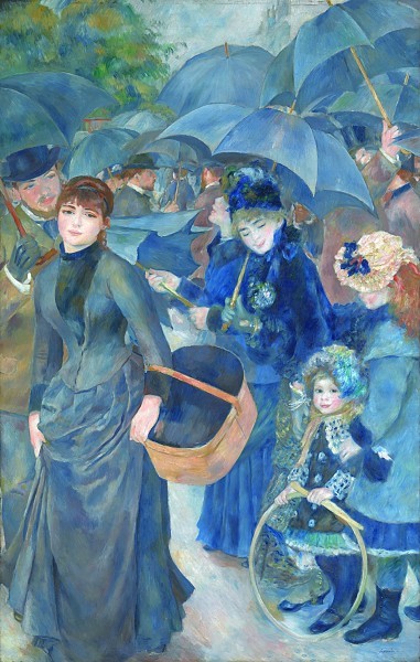 印象派画家雷诺阿在其转型时期绘制的作品《伞》是这种颜料的一个有趣范例。画面右边的一组四个人(包括一个小姑娘),是他所惯用的“经典雷诺阿式”印象派画法,用大量钴蓝色和黑色调在一起,早前他著名的《煎饼磨坊的舞会》中许多人物都使用了这种典型配色。然而在《伞》画面左边走向画外的姑娘,是他晚了一两年重新画就的,这标志着他的风格转型——他运用了他从好友塞尚那里吸取来的办法,将群青、白色和赭石色,以一种更有节奏感、更沉着的笔触编织起来,以确立人物纪念碑式的立体感。
