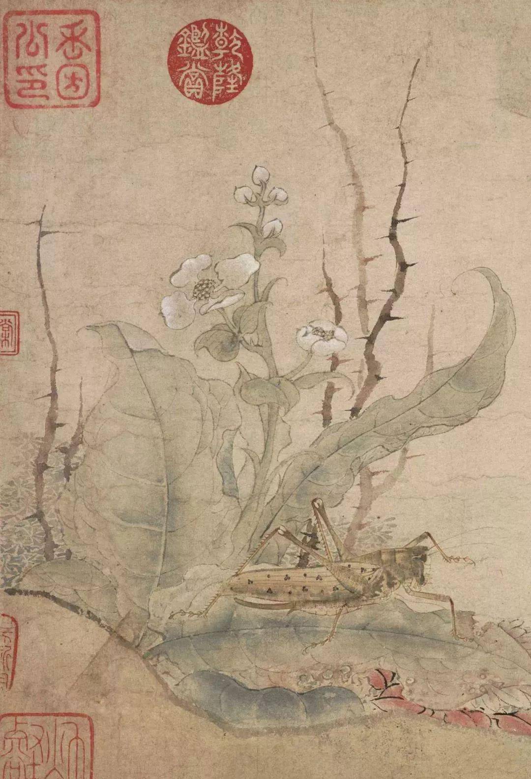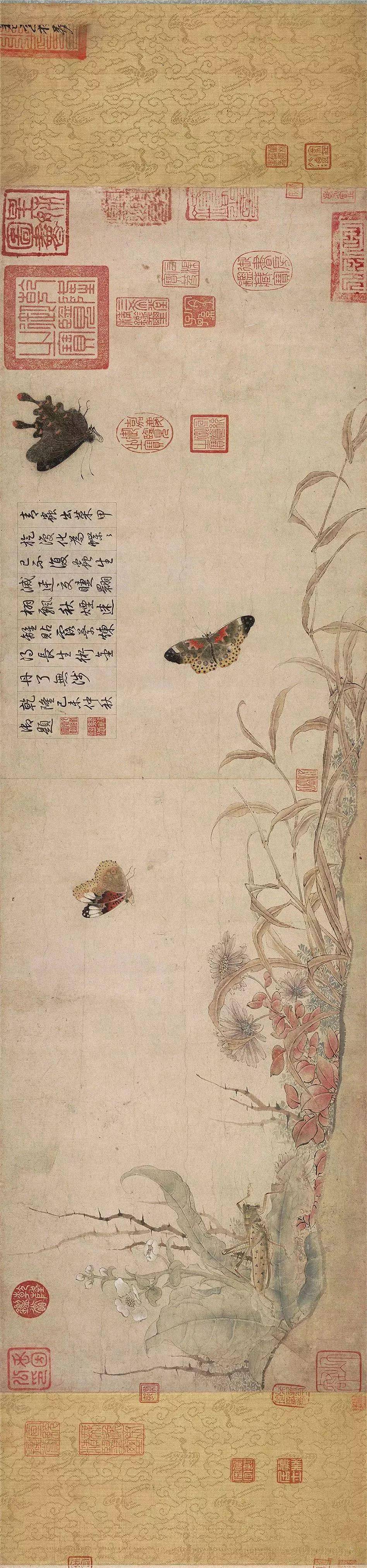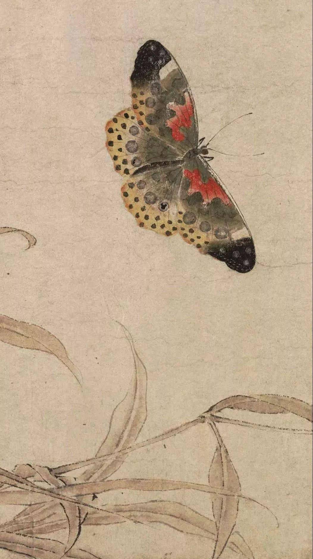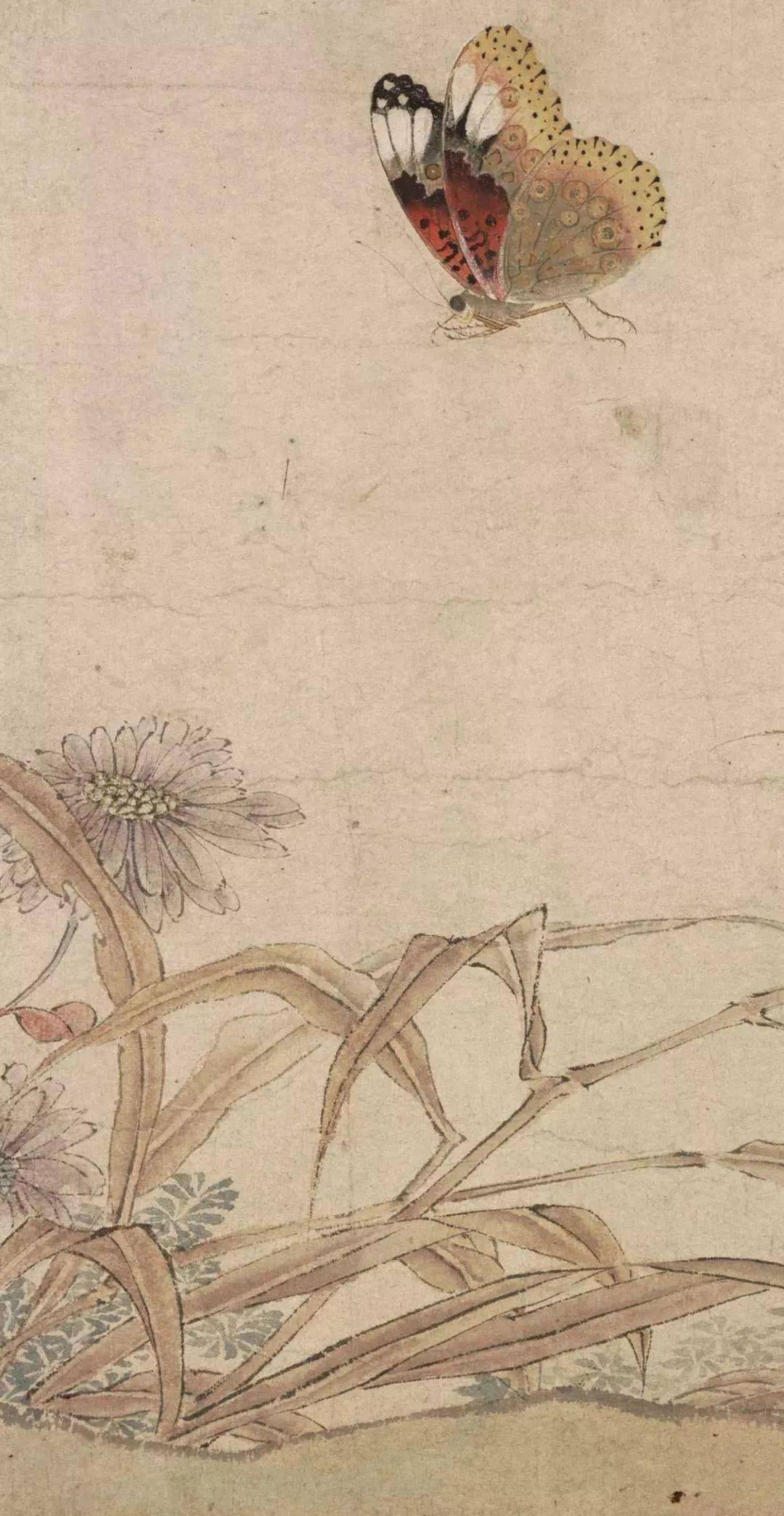 现藏于故宫博物院的《写生蛱蝶图》卷,便展现了一派秋日旷野图景。蚱蜢欲跳未跳、蛱蝶悠然翻飞,秋花枯芦在画面中毫不喧宾夺主。