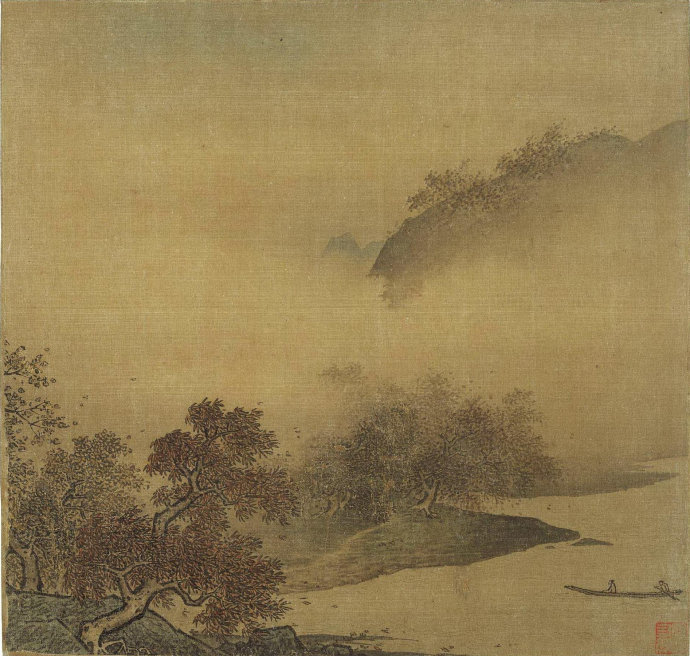 最早以“虚”“实”论画的文字,见于李澄叟形容李唐:“落墨苍硬,辟绰简径,谓之实里有虚”,此件《江山小景》即是“虚”“实”对应的例证。李唐将代表实景的山石、林木、寺院置于画面下方和右上角,中间以虚旷的江水隔开两岸,为“近岸广水、旷阔远山”的设计,此画可视为南宋马、夏派的半边或对角线构图形成之前的一种过渡风格。
