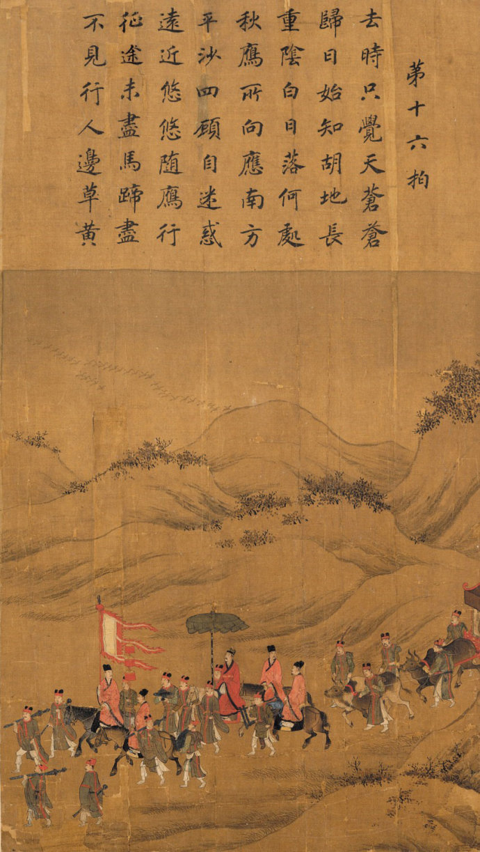 画中有许多点景人物,活动、体态各不相同,有泛舟、渔钓、耕归、讲道等等,多半以简笔画出,粗具形态,带有一种拙趣。此类简笔画风,对于南宋的马、夏派有直接的影响。