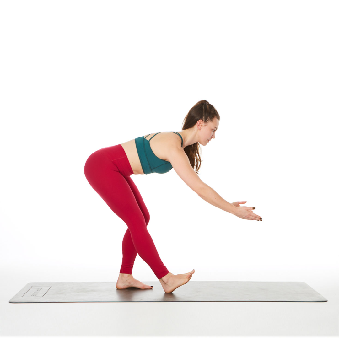 吸气,双腿微微屈膝,坐骨向后向上